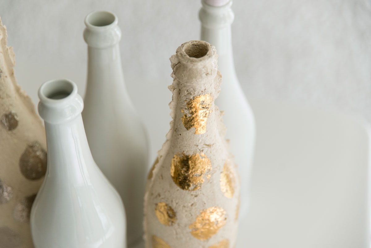 Champagne bottle shaped vases made either from a unique stoneware and paper mixture, or hand poured from finest Limoges porcelain - each piece is a unique decorative or functional original. Finished in glaze and bisque porcelain combination while the stoneware pieces are delicate decorated