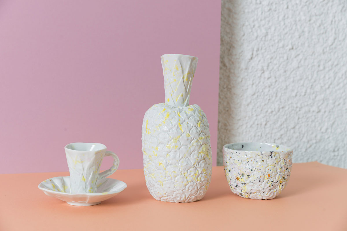 The collection consists of vases, jars with lid, bowls and cups with saucers in white or in various colors and designs, hand made with high-quality french porcelain, glazed insides in combination with bisque surface finely decorated by hand painting in gold or platinum.