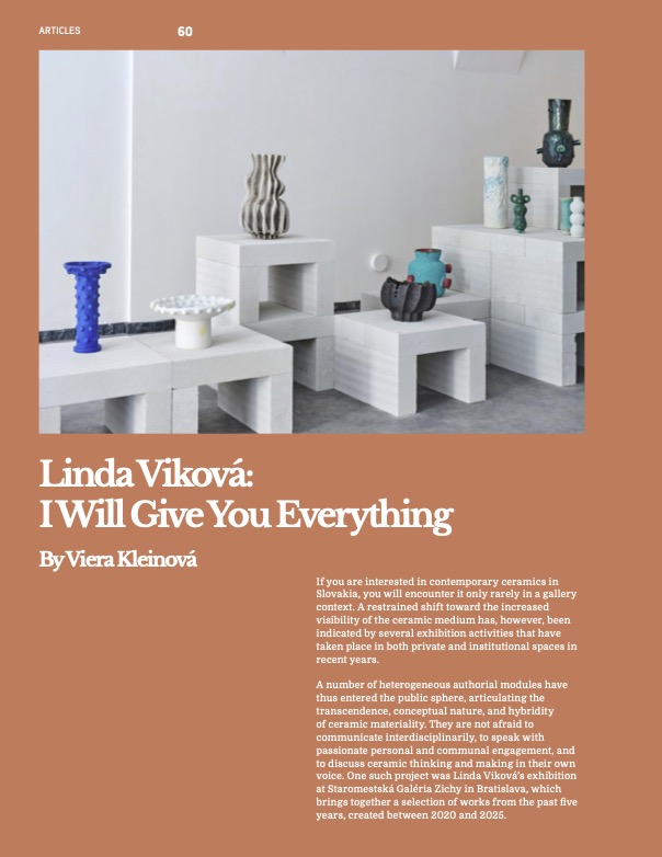 Výstava Lindy Vikovej prináša na pôdoryse rokov 2020–2025 náhľad do jej autorskej praxe v médiu hliny. Jej práca je ukotvená v bezprostrednom kontakte s materialitou keramiky a porcelánu a dlhodobo sa pohybuje na pružnej trajektórii dizajnu a sochárstva. Ona sama vzťah ku keramike deklaruje ako bezpodmienečný, nepodlieha však tyranii technológie, obchádza pasce hermetického sentimentalizmu a svoju pozíciu reformuje koncentrovaným materiálovým výskumom.