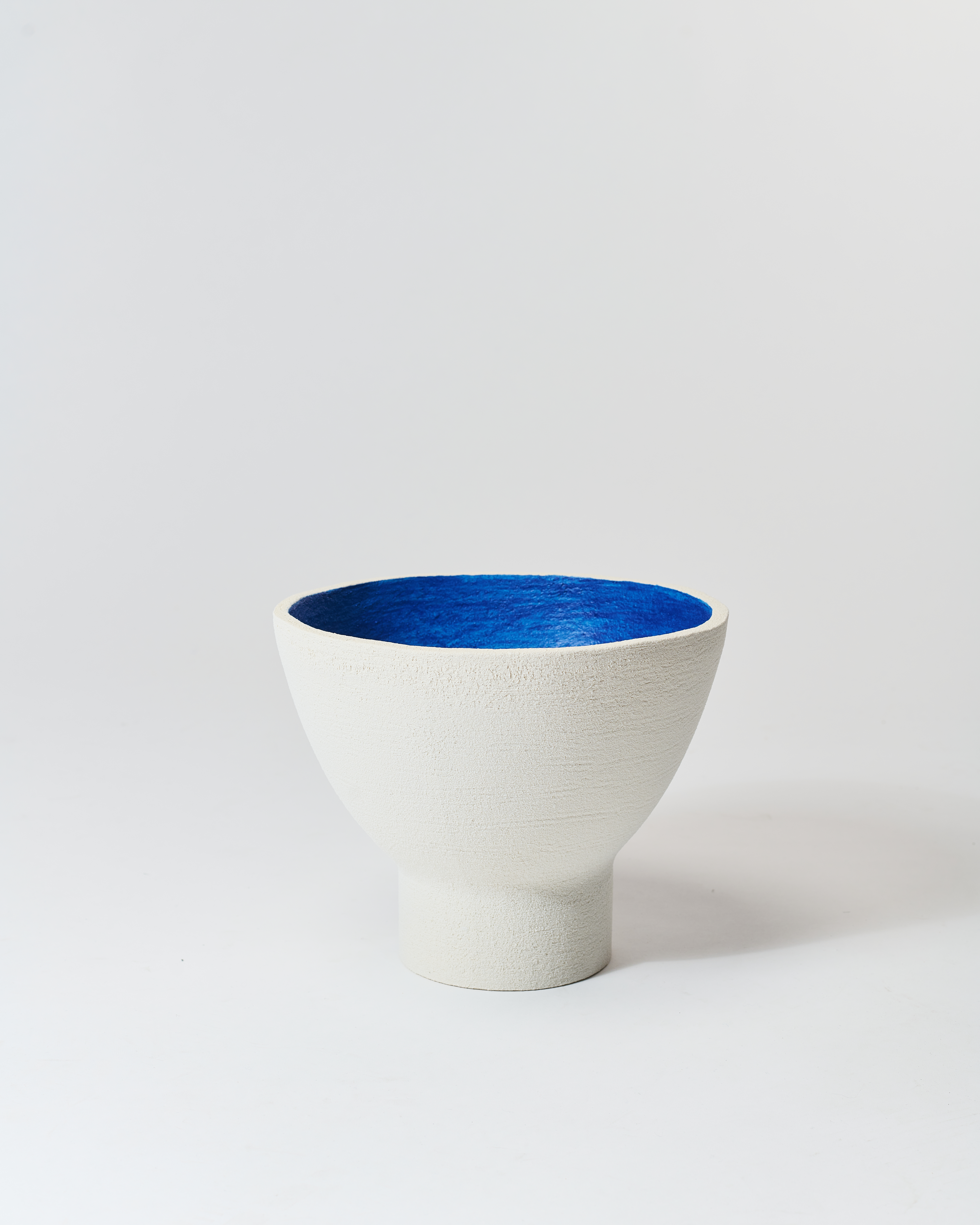 The white, rough-to-touch surface vessel, is hand-built from stoneware clay with a porcelain spray coat, glazed inside. Accidentally broke during photo shoot.